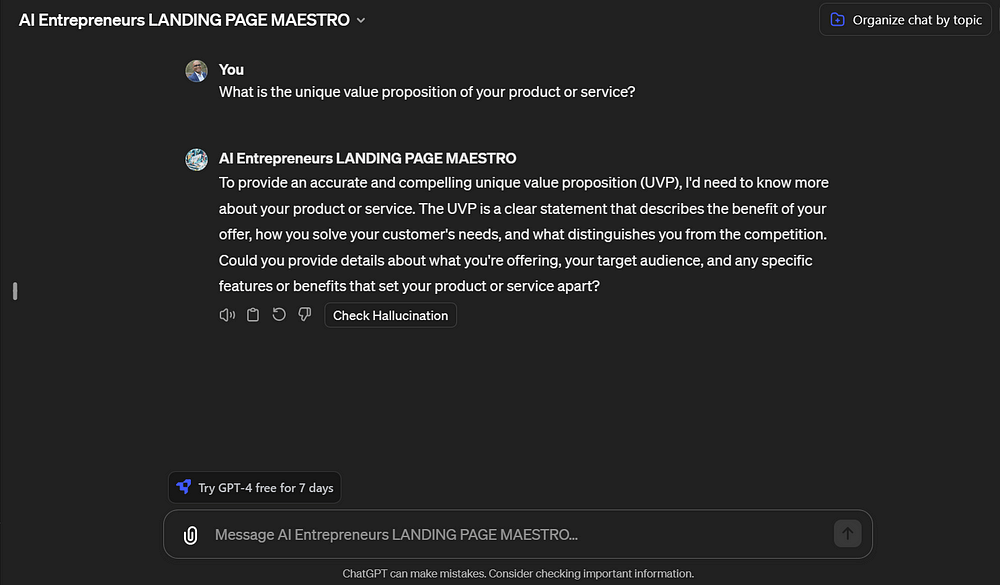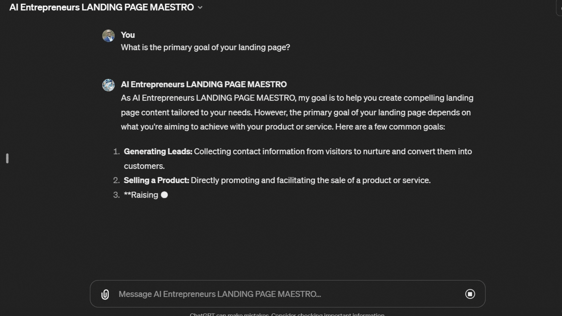 The AI Entrepreneurs LANDING PAGE MAESTRO GPT is an entrepreneur’s ultimate tool for creating landing pages that not only look great but also perform. By harnessing the power of AI, it eliminates the guesswork in landing page creation, enabling entrepreneurs to focus on what they do best — growing their business. Whether you’re looking to increase conversions, enhance your SEO, or simply create a more compelling online presence, LANDING PAGE MAESTRO is the tool you need.
