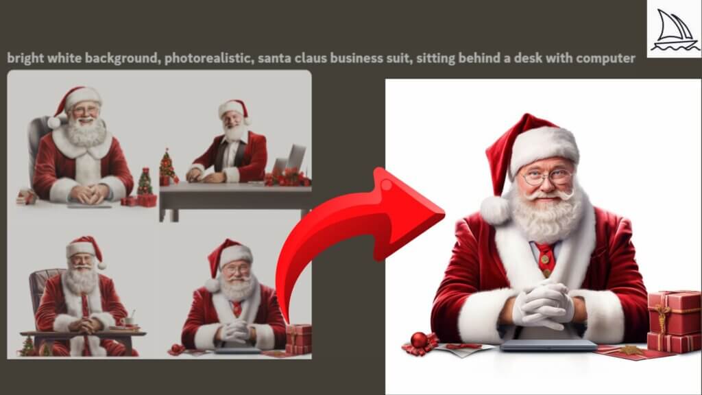Try the Prompt: For a festive twist, use "Bright white background, photo-realistic Santa Claus sitting behind the desk with a computer."